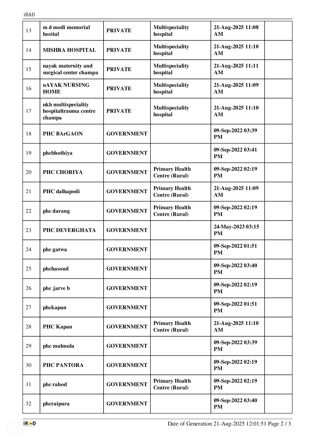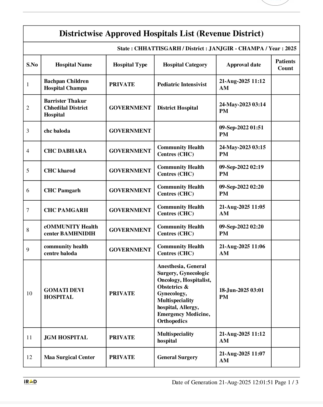 ⏩ जांजगीर चांपा जिले में *पुलिस अधीक्षक श्री विजय कुमार पाण्डेय (IPS)* के निर्देश पर जिले के अस्पतालों को इस स्कीम के तहत जोड़ने की कार्यवाही की गई । इस क्रम में *अतिरिक्त पुलिस अधीक्षक यातायात श्री उदयन बेहार के नेतृत्व* में iRAD के नोडल अधिकारी श्रीमती साधना गुप्ता एवं मुख्य चिकित्सा अधिकारी जांजगीर चांपा के समन्वित प्रयास से जिले में अब तक 49 अस्पतालों को सूचीबद्ध किया गया चुका है।