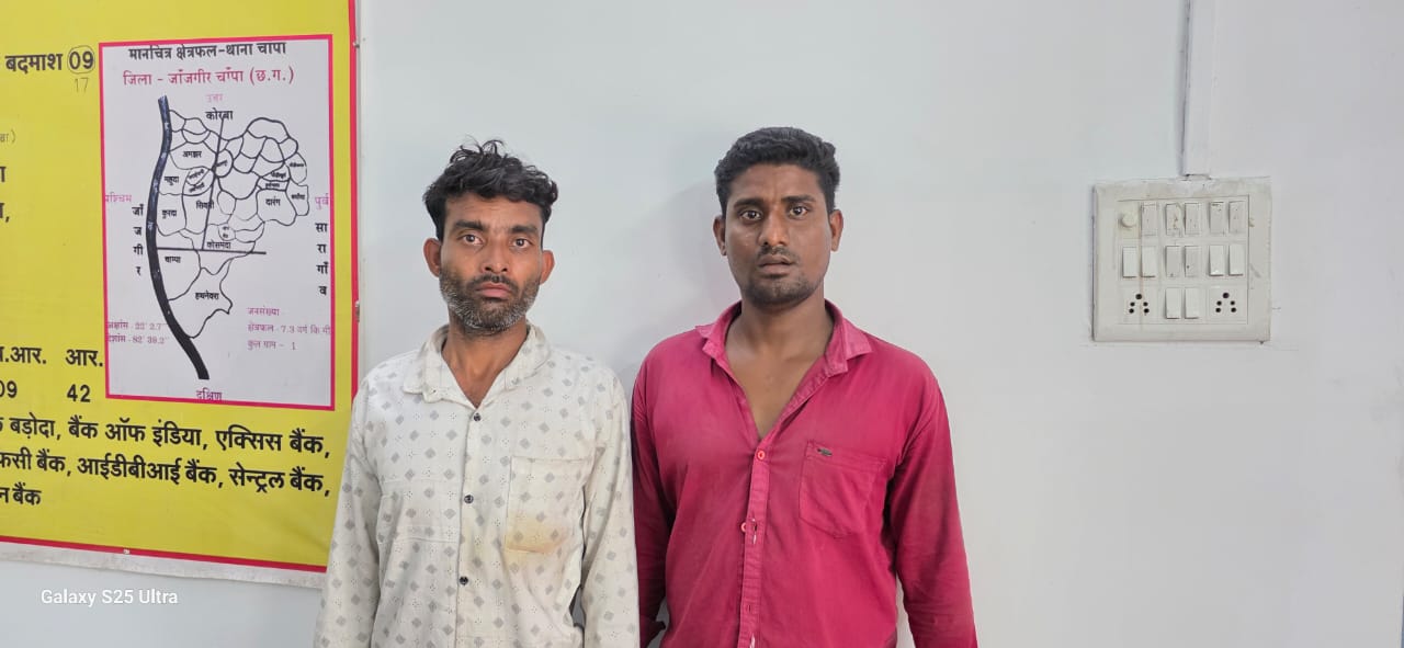 जांजगीर चाम्पा-थाना चांपा क्षेत्रांतर्गत ग्राम कुरदा के कबीर चौक में गणेश पूजा पंडाल बना हुआ है। आज दिनांक 30.08.2025 को सुबह दो सामाजिक तत्व शराब के नशे में वहाँ पहुँचे और हंगामा करने लगे। इस दौरान पंडाल में उपस्थित समिति के सदस्यों से विवाद हुआ तथा दोनों ने आवेदक राजू दास महंत के साथ मारपीट भी की, घटना की सूचना पाकर थाना चांपा पुलिस ने तत्काल कार्रवाई करते हुए दोनों आरोपियों वीरेंद्र बंजारे एवं मंजूलाल उर्फ राजेश बंजारे निवासी कुरदा को पकड़ा जिसके विरुद्ध विधिवत कार्यवाही करते हुए गिरफ्तार कर न्यायिक रिमांड पर भेजा गया। इस मामले में थाना चांपा में धार्मिक भावनाओं को आहत करने वाले सहित विभिन्न धाराओं के तहत अपराध पंजीबद्ध कर विवेचना की जा रही है।