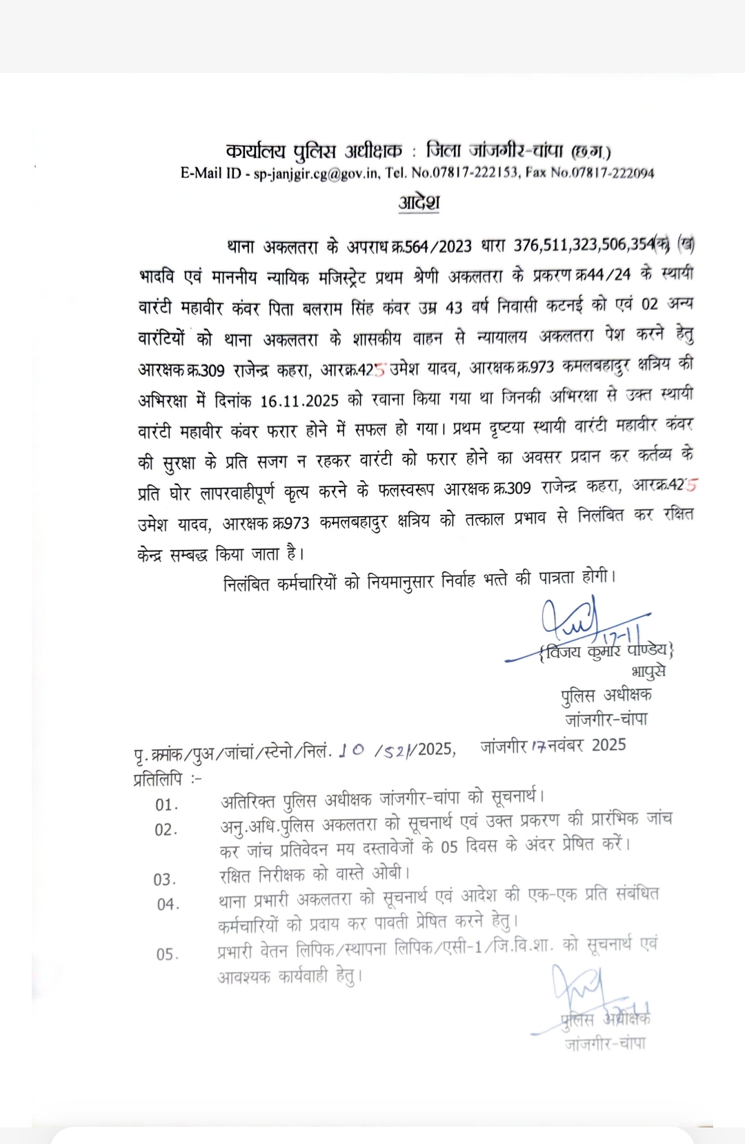 निलंबित आरक्षकों का नाम 1. आरक्षक राजेंद्र कहरा थाना अकलतरा 2. आरक्षक उमेश यादव थाना अकलतरा 3. आरक्षक कमल बहादुर क्षत्रिय थाना अकलतरा जांजगीर चाम्पा-पुलिस