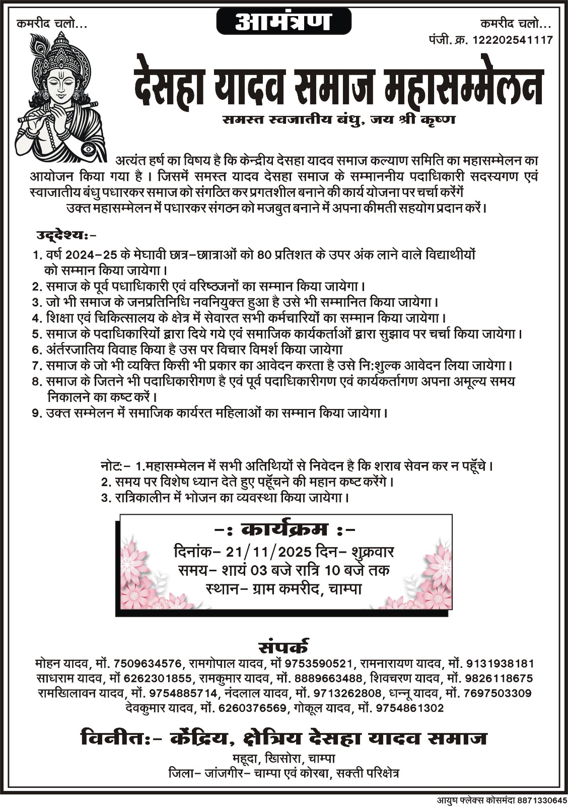 कमरीद(चाम्पा)–केंद्रीय देसहा यादव समाज कल्याण समिति का महासम्मेलन आज 21/11/2025 को कमरीद में रखी गई है।जिसमे देसहा यादव समाज के सम्मानीय पदाधिकारी, सदस्य,स्वजातीय बंधु, पधारकर समाज को संगठित कर प्रगतिशील बनाने की योजना पर चर्चा करेंगे।