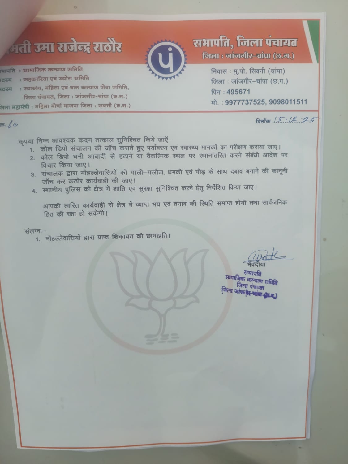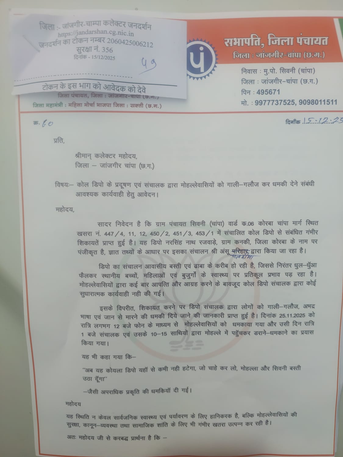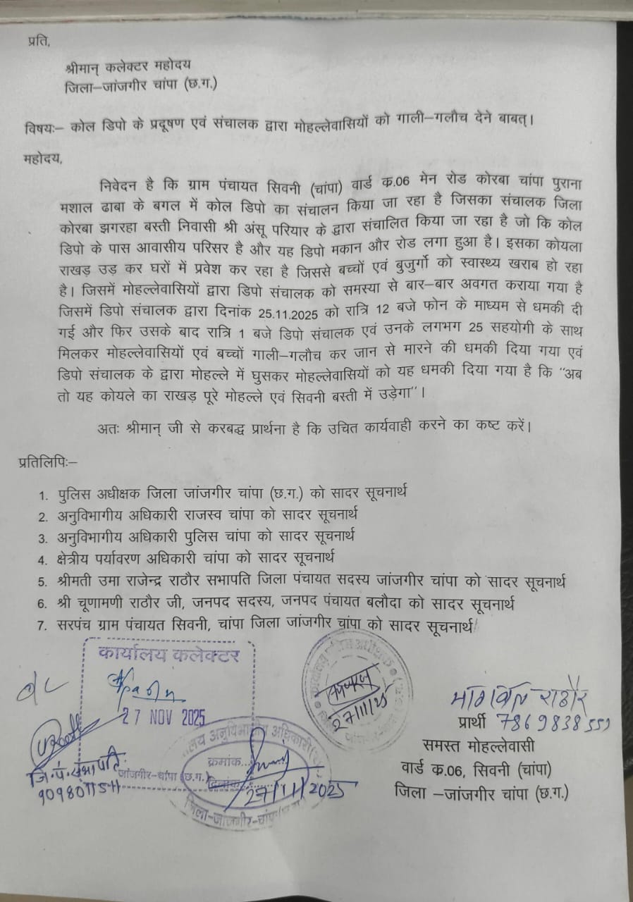 जांजगीर-चाम्पा- कोल डिपो के संचालक द्वारा क्षेत्र में प्रदूषण फैलाने व मोहल्लेवासियों को गाली-गलौज व धमकी देने को लेकर जिला पंचायत जांजगीर-चाम्पा के सभापति उमा राजेन्द्र राठौर ने कलेक्टर जांजगीर-चाम्पा को लिखित ज्ञापन देते हुए कार्रवाई की मांग की हैं। श्रीमती राठौर ने अपने ज्ञापन में बताया कि ग्राम पंचायत सिवनी (चाम्पा), वार्ड क्रमांक 6 कोरबा चाम्पा मार्ग स्थित संचालित कोल डिपो से संबंधित गंभीर शिकायतें प्राप्त हुई हैं। यह डिपो नरसिंह नाथ राजवाड़े, ग्राम कनकी, जिला कोरबा के नाम पर पंजीकृत हैं। ज्ञात तथ्यों के आधार पर इसका संचालन अंसू पलरिया द्वारा किया जा रहा है डिपो का संचालन आवासीय बस्ती के करीब हो रहा है, जिससे निरंतर धूल-धुआँ फैलकर स्थानीय बच्चों, महिलाओं एवं बुजुर्गों के स्वास्थ्य पर प्रतिकूल प्रभाव पड़ रहा है। मोहल्लेवासियों द्वारा कई बार आपत्ति और आग्रह करने के बावजूद कोल डिपो संचालक द्वारा कोई सुधारात्मक कार्यवाही नहीं की गई। इसके विपरीत, शिकायत करने पर डिपो संचालक द्वारा लोगों को गाली-गलौज, अभद्र भाषा एवं जान से मारने की धमकी दिए जाने की जानकारी प्राप्त हुई है। विगत 25 नवम्बर को रात्रि लगभग 12 बजे फोन के माध्यम से मोहल्लेवासियों को धमकाया गया तथा अगले दिन रात्रि एक बजे संचालक एवं उसके 20-25 साथियों द्वारा मोहल्ले में पहुँचकर डराने-धमकाने का प्रयास किया गया। अब यह कोयला डिपो यहाँ से कभी नहीं हटेगा, जो चाहे कर लो, मोहल्ला और सिवनी बस्ती उठा दूँगा जैसी आपराधिक प्रकृति की धमकियाँ दी गईं।
