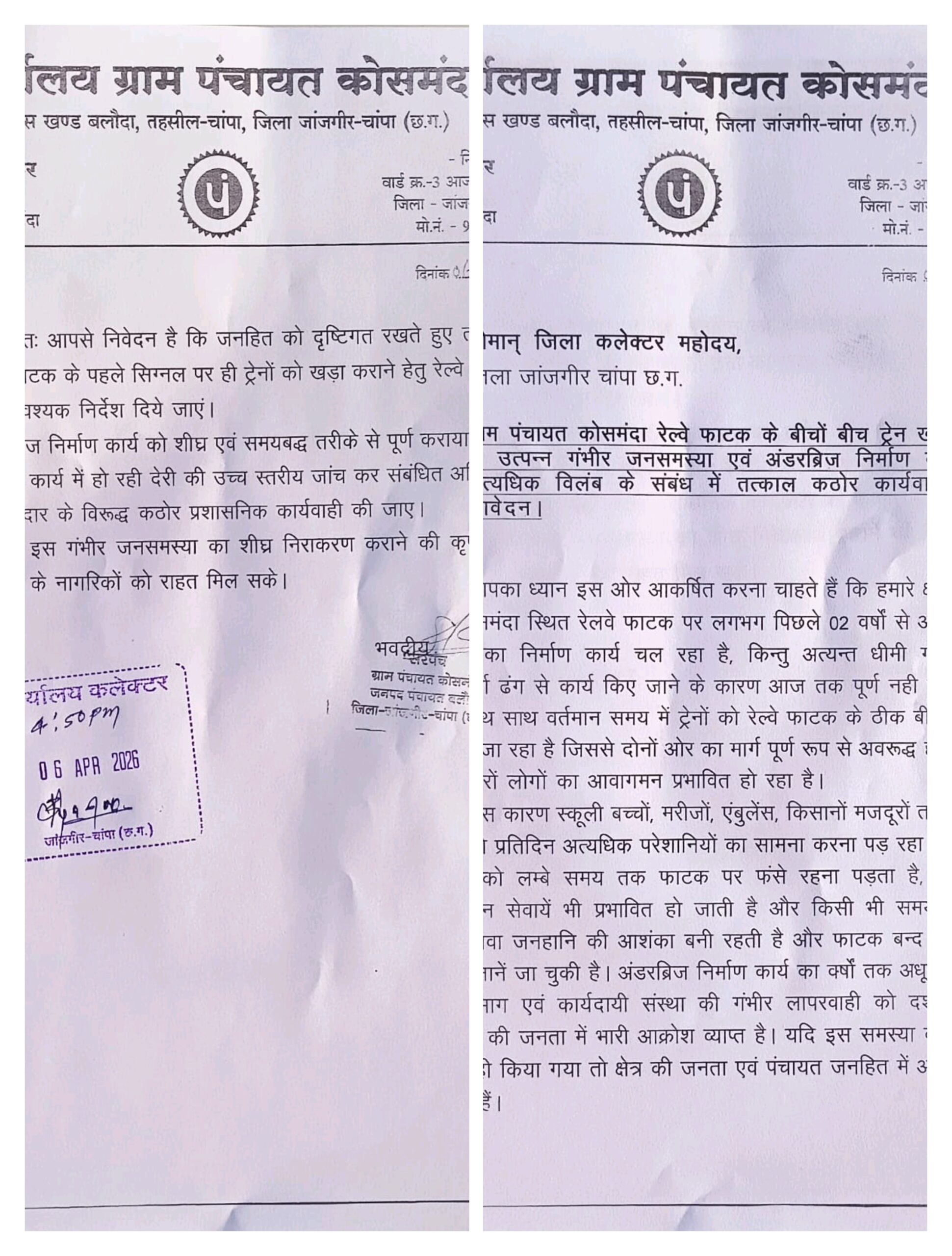 ग्राम पंचायत कोसमंदा के रेलवे फाटक पर लगातार ट्रेनों के खड़े रहने से क्षेत्र में गंभीर जनसमस्या उत्पन्न हो गई है। इस मुद्दे को लेकर ग्राम पंचायत ने जिला कलेक्टर को आवेदन सौंपकर तत्काल समाधान की मांग की है।