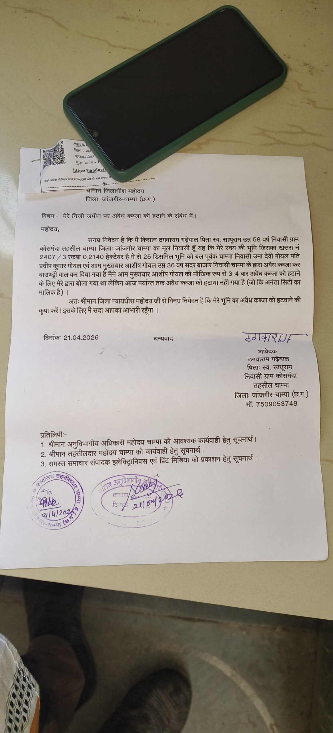 प्राप्त जानकारी के अनुसार, ग्राम कोसमंदा निवासी किसान ठगवाराम गढेवाल पिता साधुराम(उम्र 58 वर्ष) ने कलेक्टर को लिखित आवेदन देकर बताया कि उनकी जमीन, जिसका खसरा नंबर 2407/3 (रकबा 0.2140 हेक्टेयर) है, पर चाम्पा सदर निवासी उमा देवी गोयल पति प्रदीप गोयल मुख्तयार आशीष गोयल  द्वारा जबरन कब्जा कर लिया गया है।